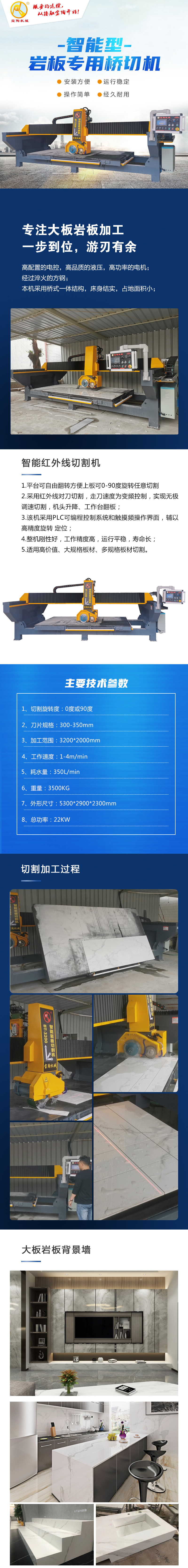 本機型操作簡單、穩定高效。巖板專用紅外線切割機,可以切割花崗巖、石英石、大理石直線(橫豎)切割機加工的理想設備。特點:精度高,切割帶修邊,慢入快切。搭配巖板專用倒角機,實現市場90%的巖板加工工藝