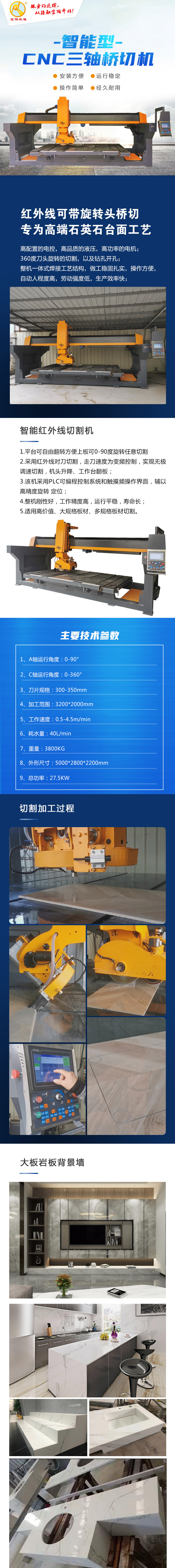 多功能三軸橋切機(jī)是一款切割、修邊、倒角、鉆孔于一體的臺(tái)面板數(shù)控加工設(shè)備。自動(dòng)化、節(jié)省人工、提高生產(chǎn)效率,生產(chǎn)過(guò)石材上下磨邊倒角拋光。一機(jī)多用,占地小,操作簡(jiǎn)單,加工精準(zhǔn),不同功能轉(zhuǎn)換快捷方便,CNC 控制,異形三角切割,鉆孔等功能,徹底克服了傳統(tǒng)紅外線橋切只能切割直線的缺點(diǎn)。廚房臺(tái)面加工設(shè)備首選設(shè)備。