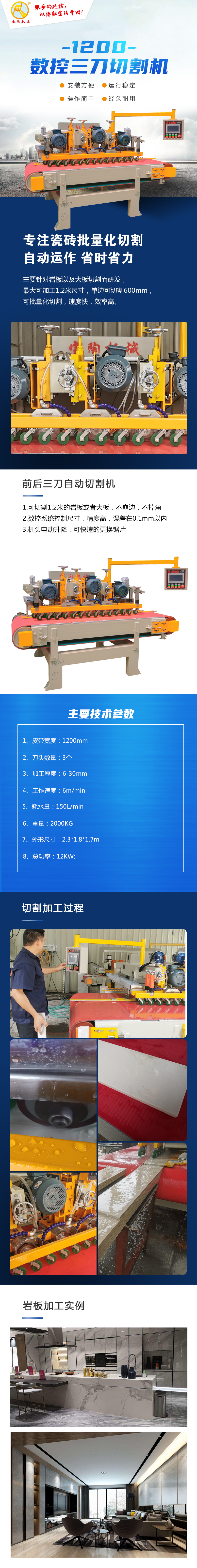 1200型巖板數控三刀切割機主要針對巖板以及大板切割而研發,最大可加工1.2米尺寸,單邊可切割600mm,可批量化切割,速度快,效率高。1.可切割1.2米的巖板或者大板,不崩邊,不掉角2.數控系統控制尺寸,精度高,誤差在0.1mm以內3.機頭電動升降,可快速的更換鋸片